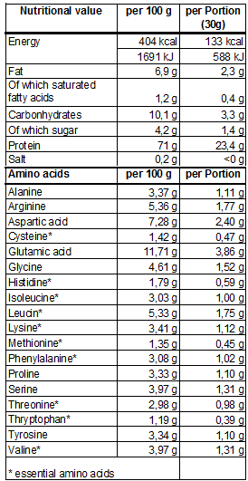 It has an outstandingly balanced amino acid profile plus a natural mix of omega-3 and omega-6 fatty acids with a fine, nutty taste.