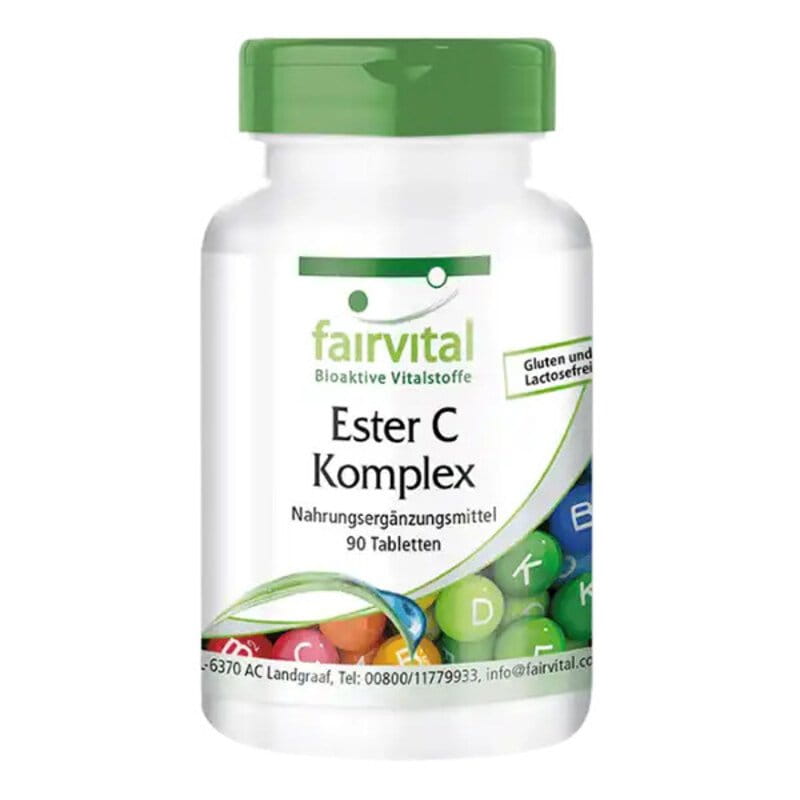 Calcium L-ascorbate (Ester-C®), bulking agent microcrystalline cellulose, citrus bioflavonoids (contains 60% hesperidin), acerola fruit powder (Malpighia glabra L., contains 25% vitamin C), rosehip fruit extract 10:1 (Rosa canina L., contains 0.2% vitamin C), anti-caking agent stearic acid, rutin, anti-caking agent calcium salts of orthophosphoric acid
