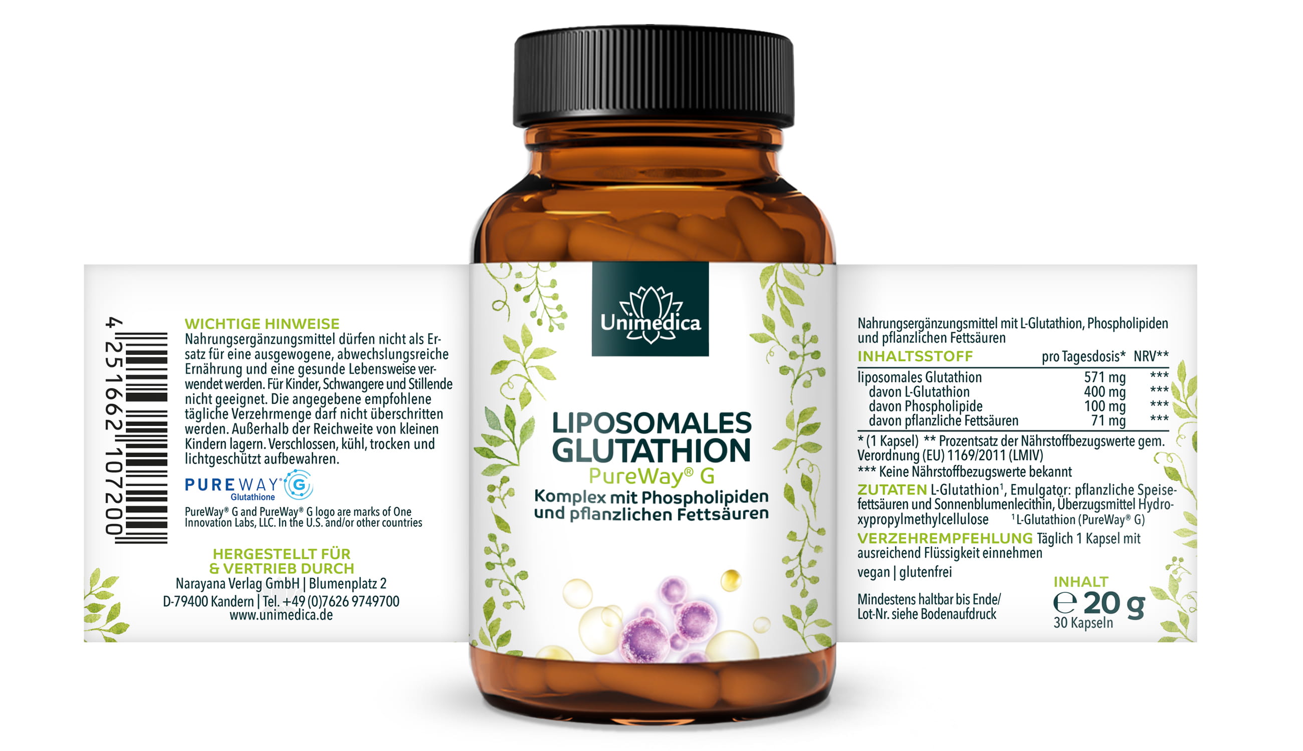 Liposomal Glutathione PureWay ® G from Unimedica is, according to legal requirements, free of additives such as colouring; it is also GMO-free, lactose-free, gluten-free and vegan.