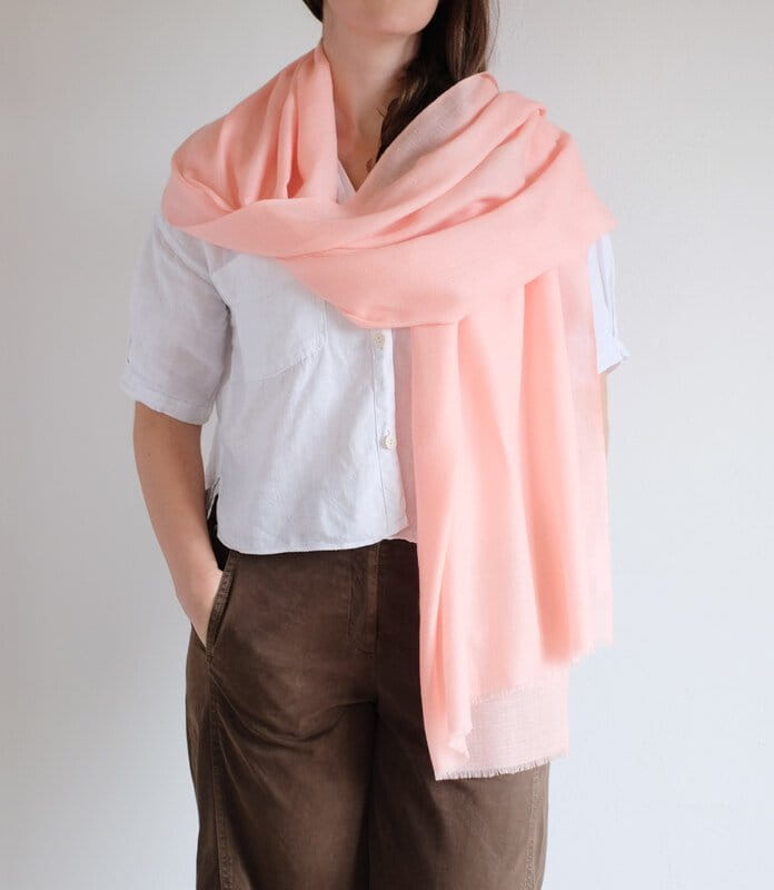 The scarves are very comfortable to wear, lightweight and temperature-regulating at the same time. They are versatile — in spring and summer as an airy shoulder wrap and in autumn and winter as a warming knotted scarf. The scarf is so fine that it can be pulled through a ring.