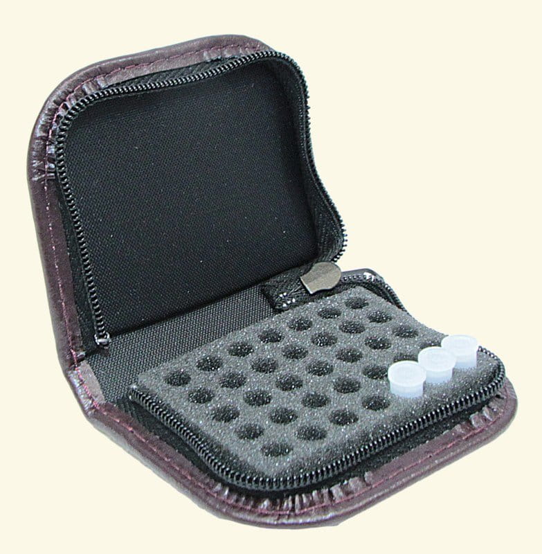High quality leather case with foam insert, with 35 holes to securely hold the vials.