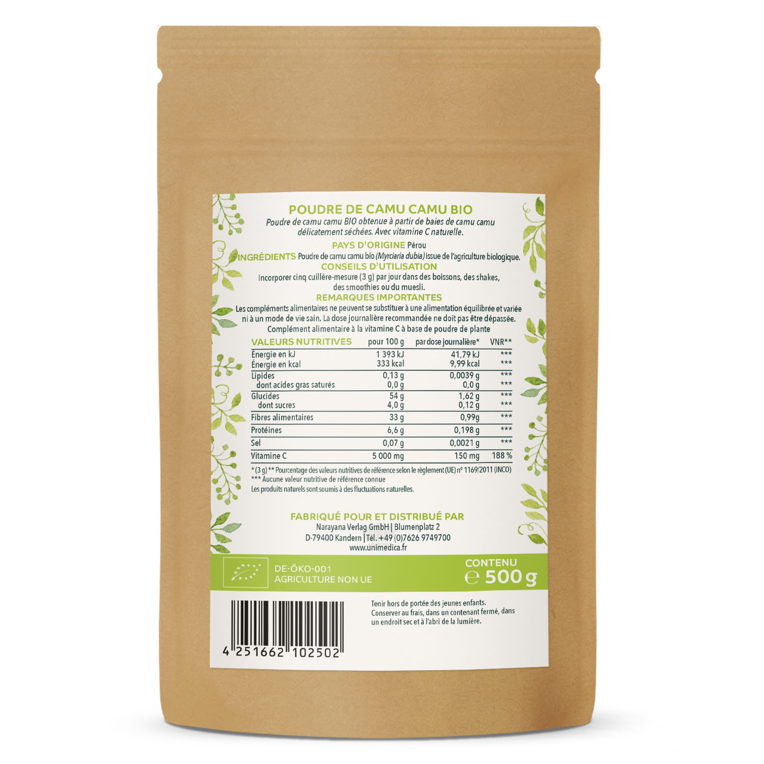 Each pack of Organic Camu Camu powder from Unimedica contains 500 g of powder.