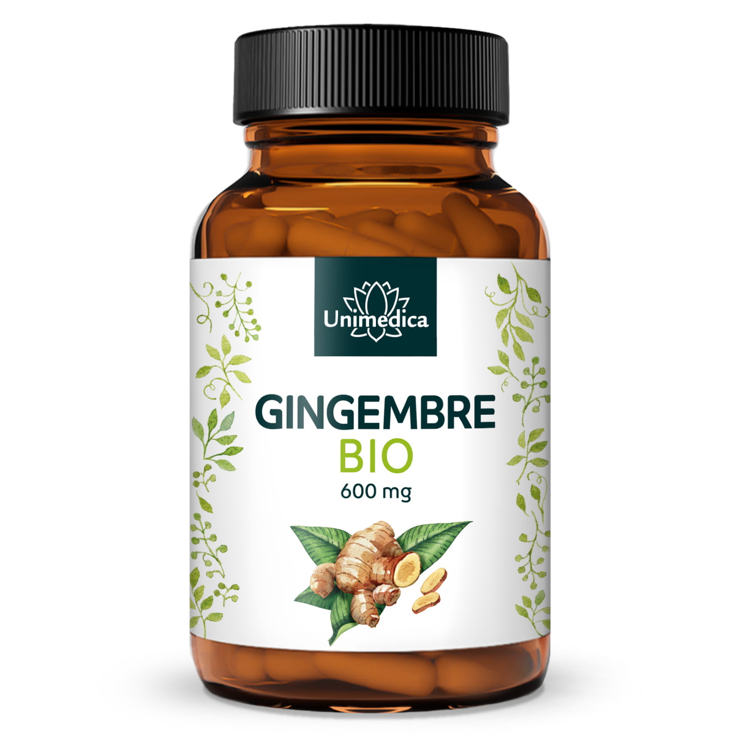 Unimedica Organic Ginger Capsules contain 600 mg organic ginger powder per capsule.