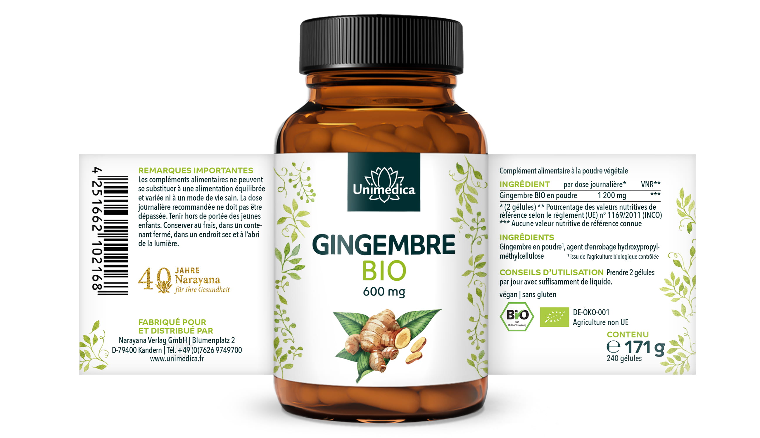 Vegan capsule shell made from pure plant cellulose (HPMC), free from carrageenan and PEG. Unimedica Organic Ginger Capsules are, in accordance with legal requirements, free from preservatives, and additionally contain no additives such as colourings, stabilisers, anti-caking agents such as magnesium stearate; they are non-GMO, lactose-free, gluten-free and vegan.