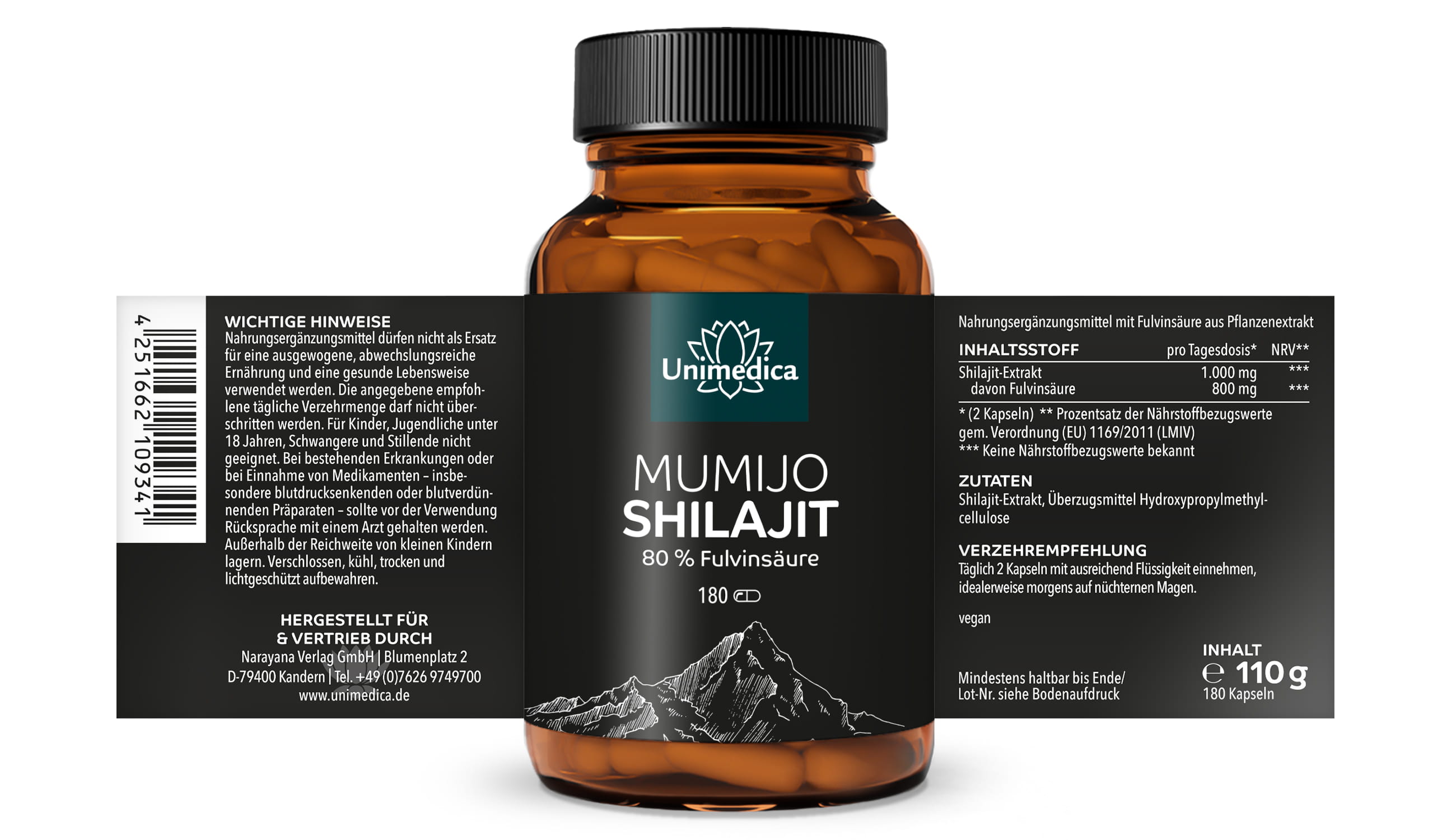 Each jar of Mumijo Shilajit from Unimedica contains 180 capsules. This corresponds to a 3-month supply.