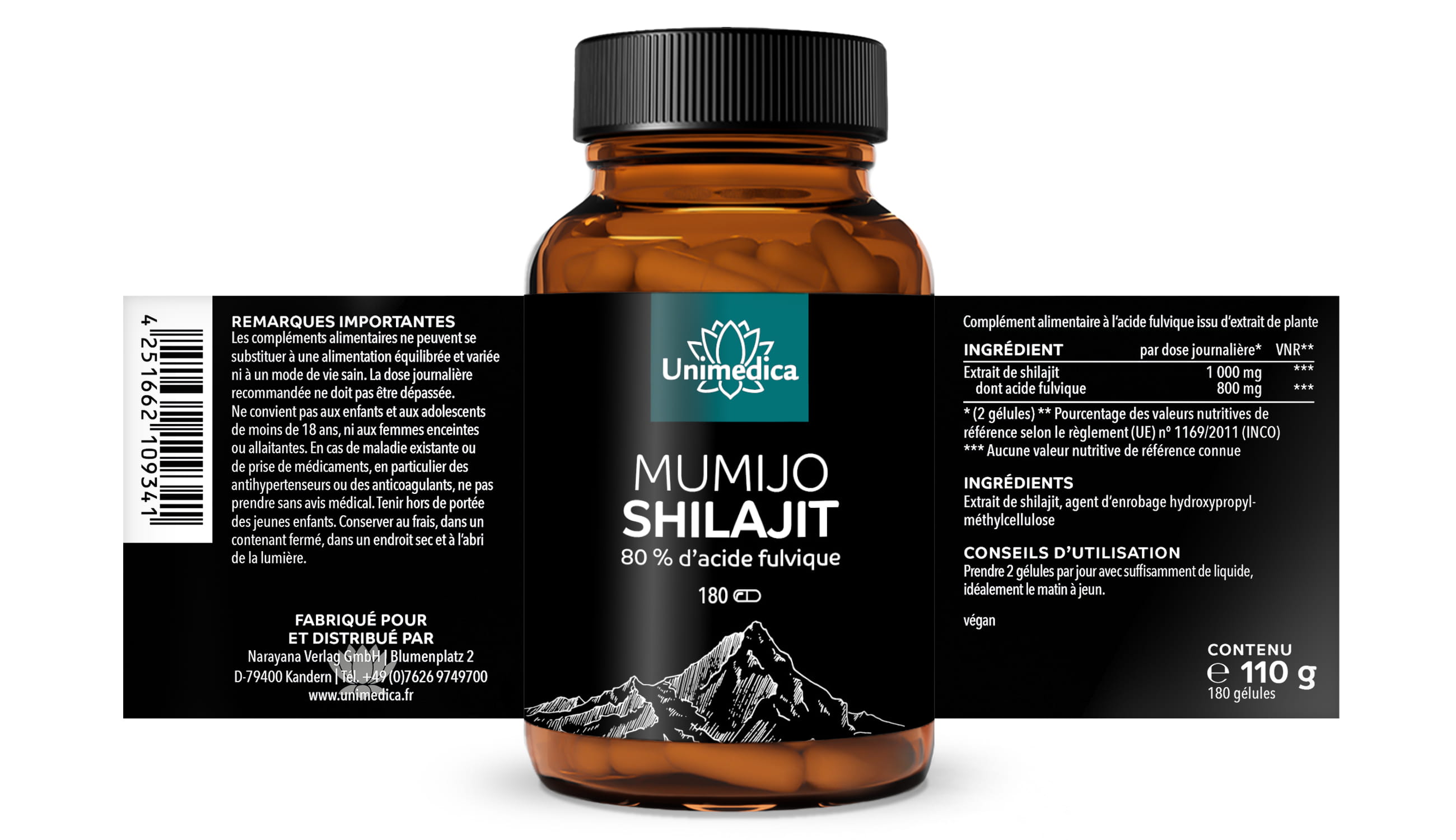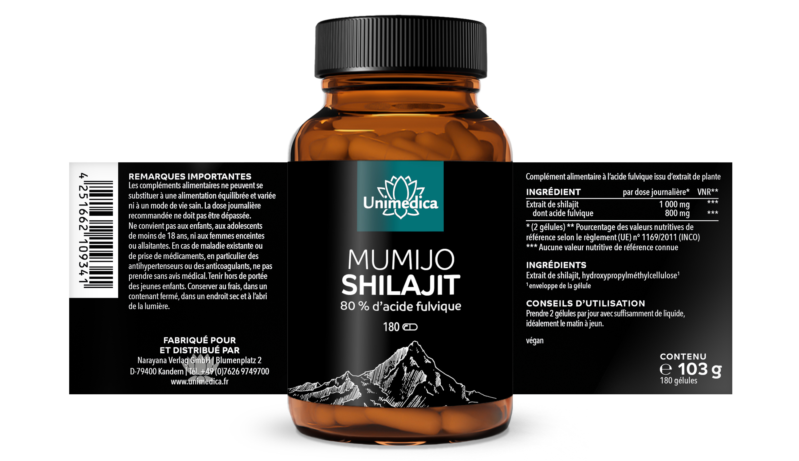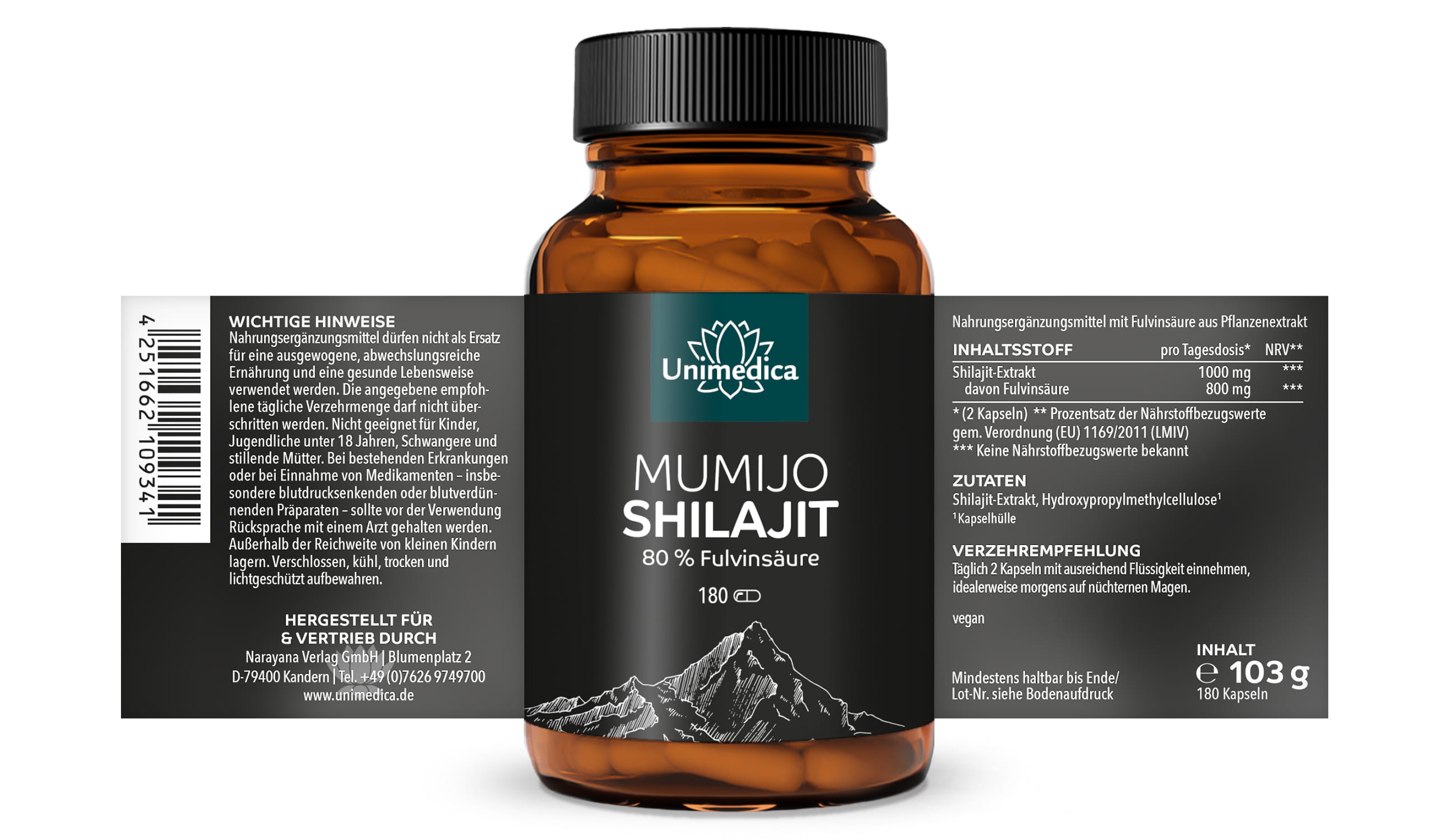 Mumijo Shilajit capsules from Unimedica are, in accordance with legal requirements, free from additives such as colourings, stabilisers, excipients like magnesium stearate, and are GMO-free and vegan.