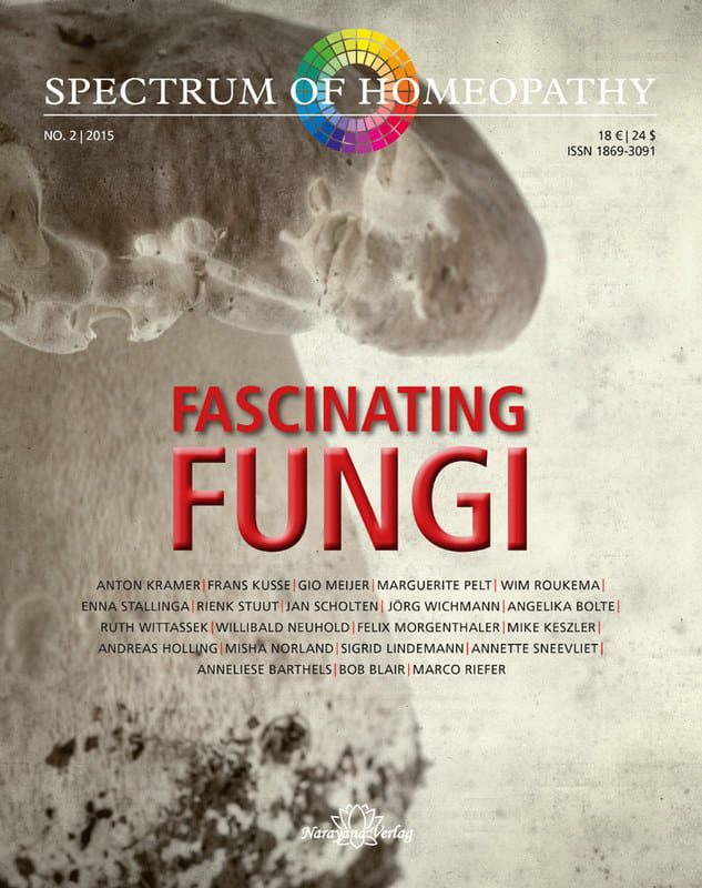 Fungi are overwhelmingly concealed – under the earth or within other organisms. With their caps, tubes and bulbs they reveal at most their reproductive organs. In homeopathy too, there are only a few visible representatives of this natural kingdom. Situated somewhere between plants and animals, fungi are difficult to classify. Yet their effects on people are very interesting, whether as intestinal symbiont or agent of disease, as intoxicant or medicine, as food or poison. This spectrum of action promises a wide range of homeopathic applications, which have so far been greatly underutilised. With new remedy provings, miasmatic connections and intriguing case histories, our group of international authors describes the magical kingdom of Agaricus, Bovista and Secale in homeopathic terms – from simple yeasts and lichens to the massive organisms of the higher fungi. The articles as a whole illustrate this complex natural kingdom. In this issue SPECTRUM presents another, particularly fascinating chapter in its modern, living materia medica.