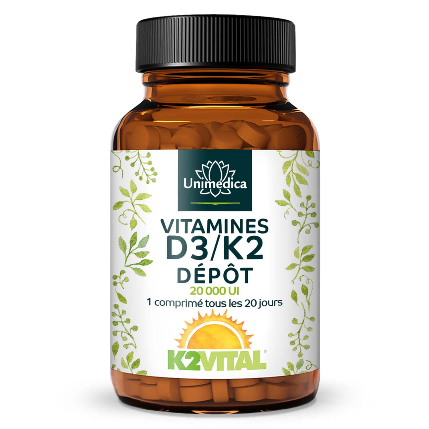 The vitamin D3/K2 depot tablets from Unimedica bring both vitamins together, because they cannot do without each other when it comes to bones. The dosage is so high that one tablet every 20 days is sufficient to ensure an adequate, daily basic supply of vitamin D and vitamin K. The body draws on the depot. The body makes use of the depot. This corresponds to a daily intake of 25µg vitamin D3 (1000 I.U., 500% NRV) and 10µg vitamin K2 (MK-7), (10µg per day = 13% NRV).