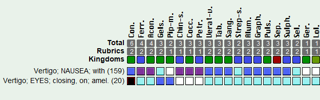 Ein Beispiel: Nehmen wir eine Patientin, die über Schwindel klagt, der mit Übelkeit und Brechreiz verbunden ist; der Schwindel und der gesamte Zustand werden besser, wenn sie die Augen schließt. Diese Zeichen der Krankheit (= Symptome) repertorisiert man und vergleicht die vorgeschlagenen potentiellen Heilmittel, die zu diesen Symptomen passen. Das sieht dann so aus: